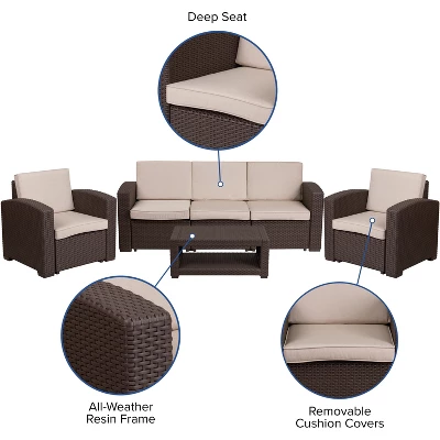 Create a breezy style and bring a new energy to your home with this stylish outdoor seating set. The durable resin frame offers a smart appearance which replicates rattan. Dense foam cushions and deep seating enhance the comfort level. All-weather cushions will hold up all season long and are zipper removable for washing purposes. The table features a lower shelf for storage of your dining and relaxation essentials or add some decorations for a splash of color. This trendy set allows you to relax with friends and family on the patio, by the pool or anywhere else you enjoy gathering together. Additional Features: Durable Resin Frame Construction, Chair (2): 32.75″W x 28″D x 32″H, Sofa: 78.5″W x 28″D x 32″H, Coffee Table: 36.5″W x 22″D x 15″H