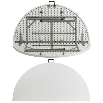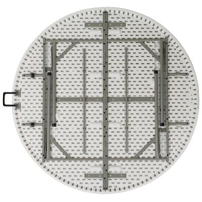 Simple and durable, this white folding table is beneficial in a variety of settings, including conferences, corporate events, school cafeterias, banquet halls and at home. Suitable for a range of activities, our folding table has a design that stands up to general wear and tear in any setting. This plastic folding table comfortably seats up to six adults while ensuring plenty of legroom. With a load capacity of 551 pounds, this plastic folding table folds in half and features a built-in carrying handle on the side for easy transportation. Our five-foot folding table is waterproof and stain- and impact-resistant to ensure long-lasting use. Its thick granite white tabletop looks attractive as-is or can be easily dressed up with a tablecloth to achieve a custom look. Speed up the time it takes to set-up and tear-down wedding receptions, graduation parties, banquets, buffets and other events with this round folding table. Whether you’re hosting an indoor or outdoor gathering, the smooth design is easy to wipe clean. When using for outdoor events store indoors to protect the frame from extreme moisture. Non-marring floor caps protect your floors against scratches while ensuring extra stability on uneven surfaces. Use this folding table for special events or on a regular basis to suit your needs. Additional Features: Folds in half for storage and travel, Includes convenient carrying handle, Gray Powder Coated Locking Legs with protective floor caps, Legs fold underneath top for flat storage, Designed for Indoor and Outdoor Use